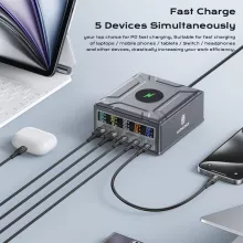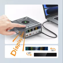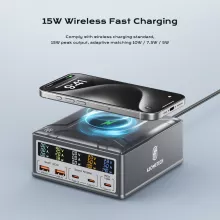 Unlike bulky old chargers, this one uses advanced Gallium Nitride (GaN) technology to deliver more power in a compact, desktop-friendly design. It also includes a built-in wireless charging pad on top, so you can simply place your phone down and charge without extra cables. The smart digital display shows real-time power usage, giving you full control and visibility over your charging setup.