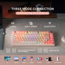 Bring your setup to life with stunning RGB lighting. Choose from 16.8 million vibrant colors and 12 music-reactive effects to match your style or mood. Adjust brightness and speed with a quick tap of the side knob or simple key combinations. This keyboard is best used when you switch between multiple devices during your day—thanks to Bluetooth 5.0, 2.4GHz wireless, and USB-C wired modes. Move effortlessly from your laptop to your desktop, tablet, or gaming console with a single side-button switch.