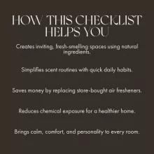 Who knew going chemical-free at home could be this fun and simple? This playful checklist has been such a delight. It's full of practical, easy-to-follow tips for creating natural scents that make my home smell so fresh and inviting. Plus, I love that it's printable - I can keep it handy in the kitchen or living room for quick reference.