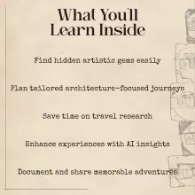 • Chapter 3: Crafting Your Personalized Art & Architecture Trips – Build itineraries that match your unique tastes with AI prompts and explore beyond traditional guidebooks with AI-powered surprises.