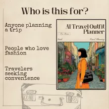 Unlike other travel packing resources, the AI Travel Outfit Planner offers personalized wardrobe advice tailored to your specific travel needs, all powered by AI. It goes beyond simple packing lists, helping you create a travel capsule wardrobe that’s stylish, versatile, and easy to mix and match. Plus, you’ll get valuable insights into using AI tools like ChatGPT and Midjourney for advanced style suggestions, all for free!