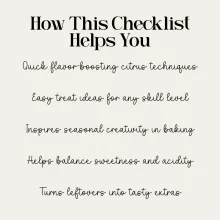 Home bakers, dessert makers, meal planners, food creators, and anyone craving fresh inspiration during the winter months. If you love citrus, love baking, or simply love filling your home with something bright and cozy, this checklist is made for you.