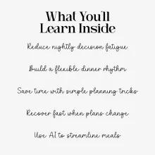 This guide is perfect for busy parents, overwhelmed professionals, caregivers, students, or anyone who wants smoother evenings and a predictable, low-stress approach to dinner. If you’re tired of starting from scratch every night or constantly wondering what to make, this resource is designed for you.