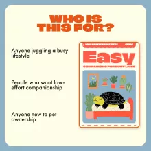 Just downloaded this guide and I'm already loving it! It's so informative and really breaks down what low maintenance means. Now, I feel confident about choosing the right pet for my busy life.