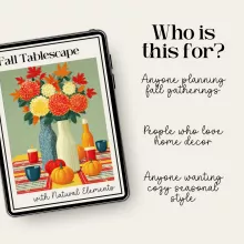I was initially skeptical about purchasing this printable guide - after all, there's plenty of free content online. But let me tell you, it has been worth every penny! Not only does it provide clear instructions for creating a stunning fall tablescape using natural elements (which is exactly my style), but it also serves as an inspiration for other areas of home decor too. It truly captures the spirit of Autumn and helps transform your space into something straight out of a magazine.