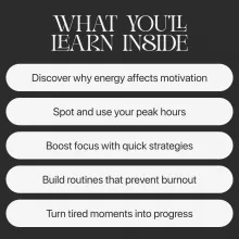 This eBook is perfect for anyone who wants to stay focused, energized, and consistent without burning out—whether you’re balancing work, studies, creative projects, or daily life. It’s a must-have for those who want to understand their energy better and make lasting progress even on low-energy days.