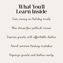 Unlike generic holiday cookbooks, this ebook focuses specifically on how to build a budget-friendly holiday potluck menu while also covering real-life challenges like guest coordination, limited funds, last-minute changes, and stress management. It combines planning, budgeting, recipes, and hosting into one simple system that actually works in real homes with real budgets.