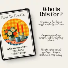 This eBook is perfect for anyone who loves cozy interiors, vintage charm, cottage-style aesthetics, or intentional hosting. Beginners, DIY decorators, home stylists, and grandmacore enthusiasts will all find practical guidance that makes table styling feel effortless and enjoyable.