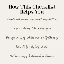 Unlike generic styling guides, this checklist focuses exclusively on warm neutrals, giving you a clear, cohesive design direction instead of overwhelming you with too many options. It also includes modern tips on using AI tools for creative inspiration, making it both practical and forward-thinking. It’s not just pretty advice — it’s a repeatable system for how to style a table with warm neutral colors in your own space.