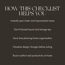 Just downloaded this digital checklist and I'm already seeing improvements in my space. It's so simple to use, just snap a photo of your cluttered area and let the AI do the rest. It suggested organization hacks that were tailored specifically to me, saving me time from having to figure it out on my own. Plus, it works for all spaces - even my home office! 🏠👍