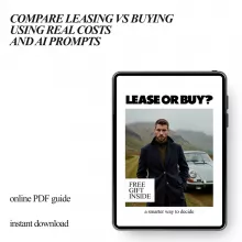 Most resources tell you what leasing or buying is, but not how to compare lease vs buy deals in a way that actually applies to your life. This guide goes beyond theory. It shows you how to evaluate deals based on driving habits, monthly budgets, and long-term goals. The included AI prompt examples make this guide especially powerful, giving you modern tools to analyze options quickly and objectively.