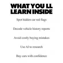 This ebook was so helpful when I was shopping for my first used car. It taught me about the early warning signs that most people overlook during test drives and helped me avoid making an expensive mistake. Plus, the AI research tips were super useful.