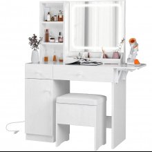 Equipped with an extra-large LED mirror featuring three adjustable light settings (warm, natural, and cold), our vanity desk ensures flawless makeup application at any time of day. The brightness can be customized with a simple long press, allowing you to perfect your look under ideal lighting conditions. Moreover, it boasts ample storage solutions including three open bookcases, three cubbies, two drawers, and a spacious cabinet with an adjustable shelf. The expansive countertop can be extended or folded to suit your spatial needs and style preferences.