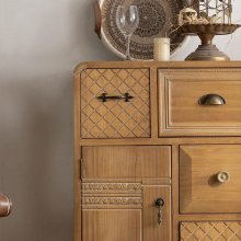 This accent cabinet is a real showstopper. The modern Moroccan design adds an exotic touch to my space making it feel warm and inviting. I love how the artistic pine wood finish brings out the beauty of the natural grain - it's truly unique! Not only does this piece look stunning, but it also offers ample storage space which is perfect for keeping things tidy. It's a great blend of form and function.