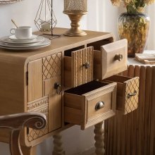 This accent cabinet is such a game changer, seriously! It's got that perfect blend of style and practical that I was on the hunt for. The moment it arrived and we set it up in our living area, boy oh boy, did things take a turn for the better! The intricate detailing on this piece is just something else altogether. You can tell at first glance that a lot of thought has been put into its design. And don't even get me started about the beautiful wood finish - it's so rich and warm, you'd think Mother Nature herself had lent her hand in crafting this beauty. But hey, let's not about functionality while we're busy appreciating its looks. This baby isn't all show with no go – far from it actually! Open those doors and voila - there’s an ample amount of space inside ready to be filled up with whatever household items you've got lying around.