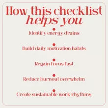 This checklist is ideal for professionals, remote workers, freelancers, and creatives who feel unmotivated but don’t want another overwhelming productivity system. If you’re experiencing a lack of motivation at work, struggling to focus, or feeling disconnected from your role, this resource was made for you.
