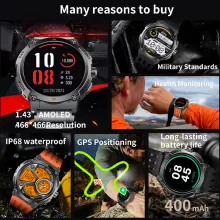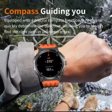 This smartwatch combines essential outdoor tools with smart everyday functions in one sleek design. The bright AMOLED screen makes every detail crisp and easy to read, even under direct sunlight — perfect for hiking, running, or cycling. Built-in GPS and compass help you stay oriented wherever you go, while Bluetooth calling keeps you connected without needing to reach for your phone. With over 100 sports modes, a full suite of health monitoring tools, voice assistant support, and quick-access controls, it’s created for people who want more than just a fitness tracker.