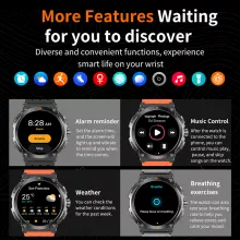 The smartwatch comes with many practical tools that fit both outdoor activities and daily routines. It supports multiple languages, tracks steps, distance, calories, heart rate, blood oxygen, sleep quality, and stress levels. You also get weather updates, reminders, music control, photo shutter, password lock, and customizable components. It works with both Android and iOS devices and offers up to 5 days of battery life. Whether you’re at the gym, on a mountain trail, or in the office, this smartwatch adapts effortlessly to your lifestyle.