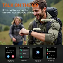 This outdoor smartwatch includes all the essential tools right at your fingertips. The bright 2.01-inch TFT touchscreen offers a crisp 280×320 resolution for easy visibility in sunlight, and Bluetooth 5.3 ensures smooth, stable connectivity. Its life-waterproof design offers protection during everyday splashes or light rain, making it a great companion for sport and outdoor use.