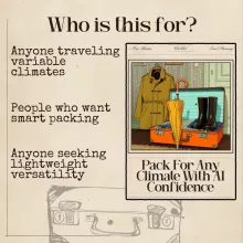 - Gain confidence that every item in your suitcase serves at least two climates or purposes.
