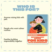 This eBook is for parents, caregivers, and educators who want to raise responsible, caring kids while maintaining a happy, well-balanced home with pets. Whether you have a dog, cat, or small animal, you’ll find actionable advice tailored to your family’s dynamic.