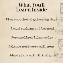 Unlike generic travel planning guides, this resource focuses specifically on pacing—the overlooked secret to great trips. It blends AI technology with human intuition, offering practical tools you can use immediately in any city worldwide.