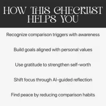 Unlike typical self-help checklists, Stop Comparing Yourself to Others integrates AI tools for real-time support, offering personalized affirmations and exercises that evolve with you. It’s practical, mindful, and designed to build self-confidence without pressure or perfectionism.