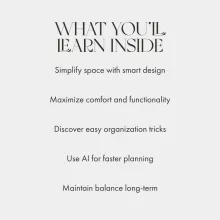 - Chapter 2: Organizing for Function and Flow – Learn zoning techniques, storage solutions, and smart AI prompts to visualize your perfect layout.