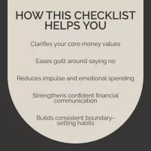 This checklist is perfect for anyone who struggles with overspending, people-pleasing, unclear money conversations, or a constant feeling of financial imbalance. It’s for those who want support, structure, and gentle accountability while learning how to hold money boundaries in daily life with confidence and compassion.