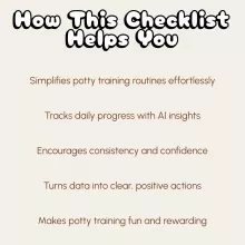 Unlike traditional potty training guides, The Checklist on Potty Training Progress with AI uses artificial intelligence to personalize the experience. By tracking data, identifying patterns, and offering actionable insights, it empowers parents to make informed adjustments — turning learning moments into confident wins.