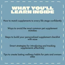 • Pet supplements checklist included: A ready-to-use printable tool that helps you personalize your pet’s supplement plan effortlessly.