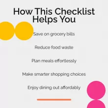 This checklist is designed to help you save money on food while still enjoying delicious, nutritious meals. Here’s a glimpse of what you’ll get: