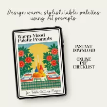 Bring instant warmth and harmony to your table with Warm-Mood Palette Prompts for Table-Setting Magic — a beautifully structured digital checklist designed to help you guide AI into creating stunning, cozy color palettes for any occasion. Whether you’re styling a fall dinner party, an intimate candlelit date, or a relaxed weekend brunch, this resource shows you exactly how to ask ai to suggest color palettes for cozy table settings in a way that feels effortless and creative.