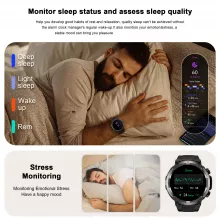 This smartwatch blends luxury design with powerful everyday functionality. With its scratch-resistant coated glass, dual-button navigation, and responsive touchscreen, it feels premium while staying incredibly practical. The watch helps you maintain a healthier lifestyle by monitoring your activity, sleep, and emotional stress. It even includes breathing exercises, weather forecasts, alarms, women’s health reminders, and playful mini-games to make your day easier and more enjoyable.