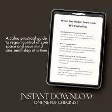 When the Room Feels Like It’s Exploding is your quick, compassionate checklist for the moments when your space—and your mind—feel like too much. This digital download is a simple, no-stress guide that helps you regain clarity and control in 15 minutes or less. Designed for anyone who’s ever stood in the middle of a messy room not knowing where to start, it’s your go-to reset button for both your environment and your energy.