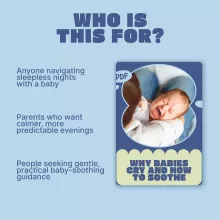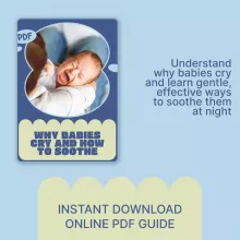 Why Babies Cry and How to Soothe is a digital download you can access instantly, anytime you need reassurance during long nights. Give yourself peace of mind and give your baby the comfort they deserve. Download now and take the first step toward calmer nights and happier days.