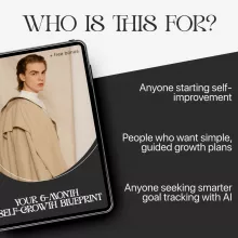 I was in a rut, feeling like I was just going through the motions of life without any real direction. That's when I stumbled upon this 6-month self-growth plan and decided to give it a shot. The transformation has been nothing short of incredible! The digital guide is so easy to use and understand, with clear instructions on how to set achievable goals that align with my personal aspirations. But what sets it apart for me is the AI-powered reflection feature - it adds such an insightful layer to my daily routine, making me more mindful of my progress and areas where I need improvement. It’s not often you come across something that genuinely motivates you towards betterment while also giving you the tools needed for tangible growth. This blueprint has been instrumental in helping me regain control over my life and setting me on a path toward fulfilling my potential.