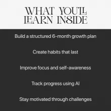 - Chapter 2: Crafting Your Growth Plan – Design your personal 6 month self growth plan, build daily and weekly habits, and learn how to use AI tracking tools.