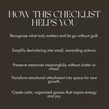 This checklist is perfect for anyone who struggles with decluttering because of emotional attachments — minimalists in progress, sentimental savers, or anyone asking themselves what to do when sentimental items block space. Whether you’re downsizing, organizing, or simplifying your home, this guide helps you release guilt and create a peaceful, purposeful space.