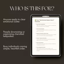 Unlike generic decluttering guides, this digital download focuses on the emotional side of letting go. It’s compassionate, easy to follow, and beautifully designed for printing or using digitally. Every section offers both clarity and comfort, helping you tidy up without tears.